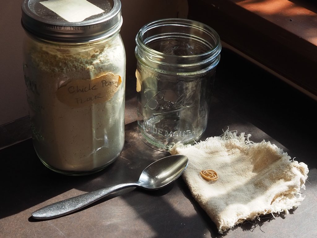 Gather your ingredients together. You’ll need chick pea flour, non-chlorinated water, a clean jar (I like a wide mouth pint jar), a spoon, a rubber band, and a covering for the starter jar.