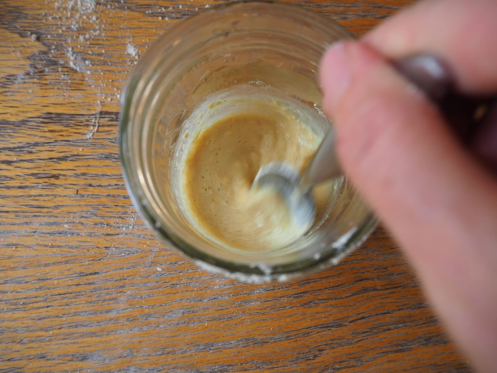 Put a couple of heaping spoonfuls of flour in the empty jar. This is not a recipe that demands precision – it’s very forgiving.