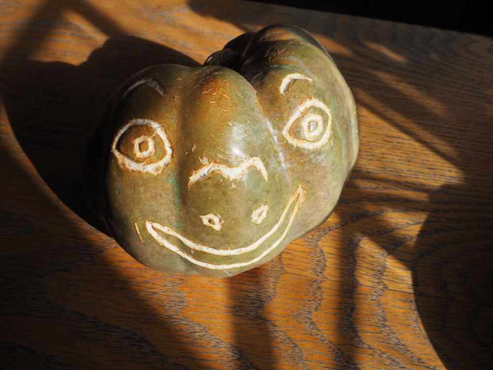 In fact, we still have one from 2019 that Chad’s father Delmer grew. It’s now over a year old and still holding up – Chad won’t let me cook it because he likes the face he carved into the skin. I can’t blame him, it is awfully cute. And when dressed in a hoody, he bears a striking resemblance to a certain extraterrestrial…