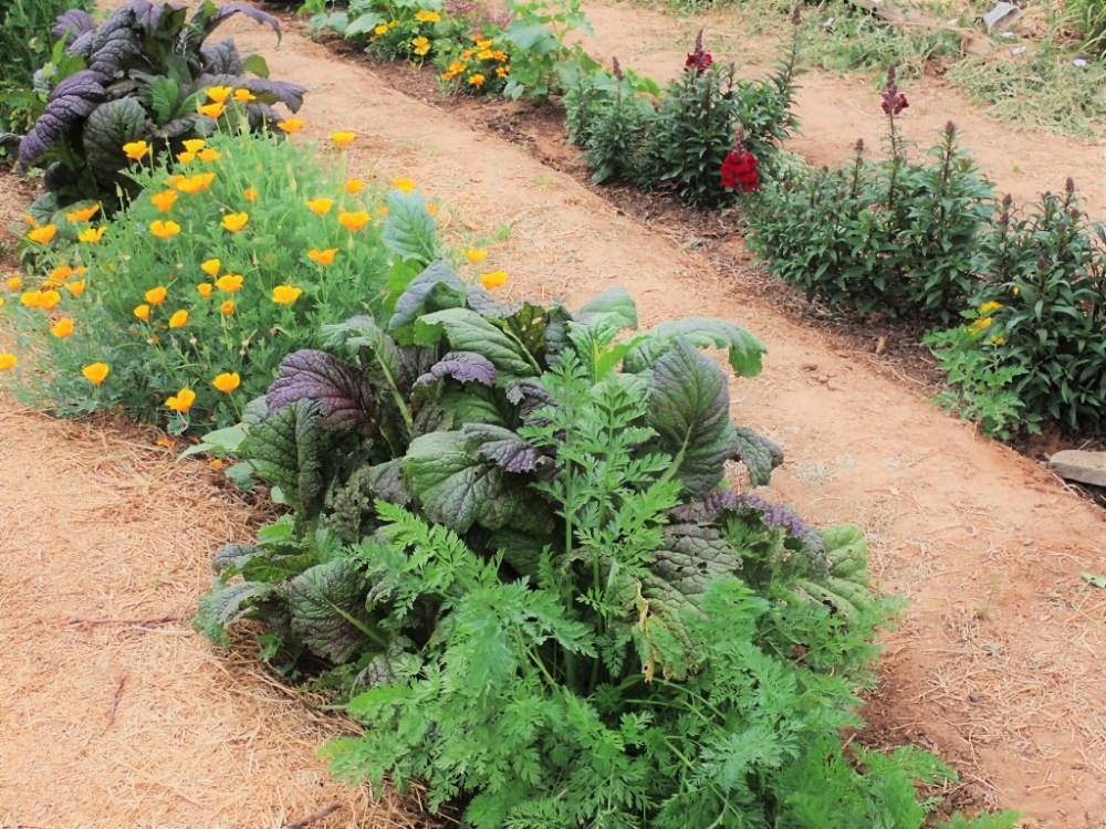 Our sunken garden rows are on a slight slope, so when I planted the seeds, they got washed down a bit and clumped together.