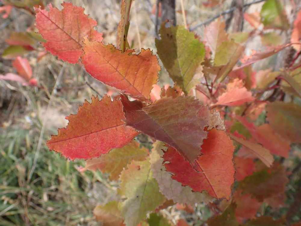 One of our three-lobed sumac bushes (also called “squawberry” locally), has started to color up, with leaves taking on a muted array or pinks and oranges.