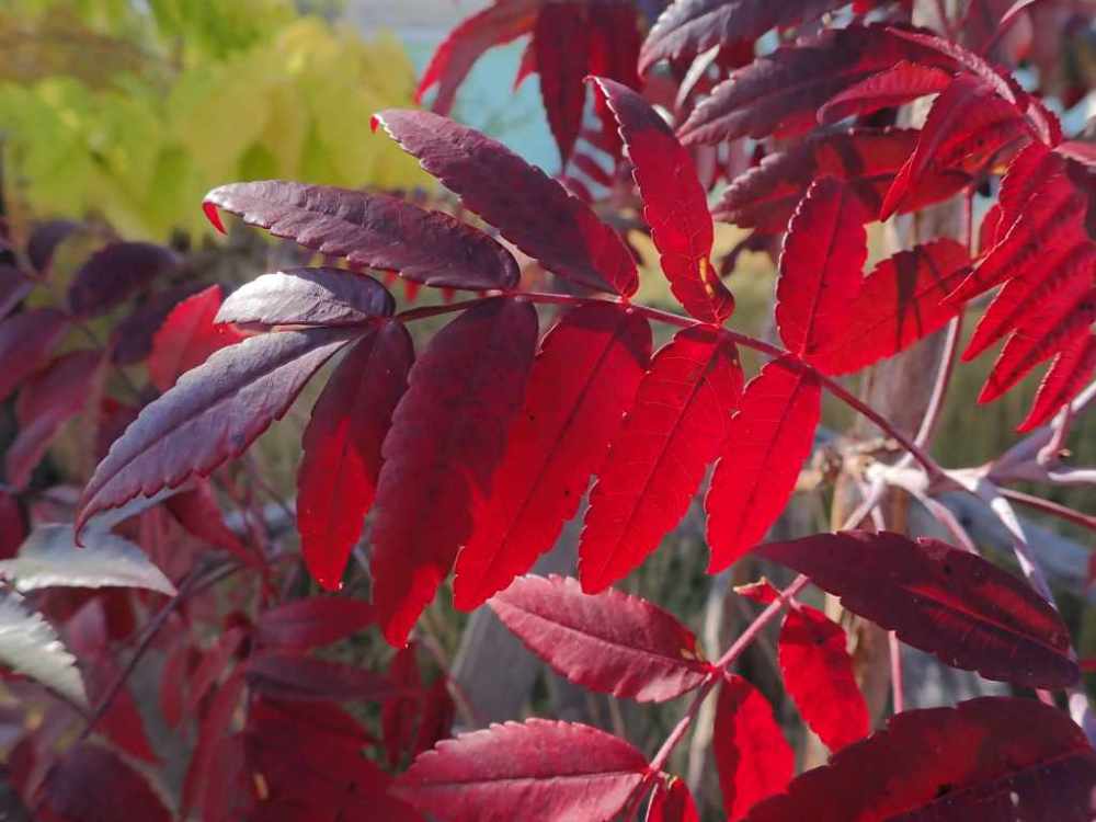 Not far from the muted tones of the squashberry bush, a near relative, smooth sumac, has taken on a striking, deep red color.