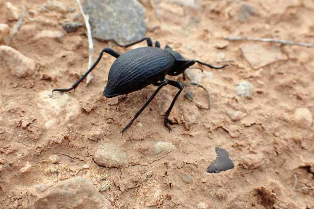 Meanwhile, black beetles wander along across the desert floor, minding their business, crawling slowly along.