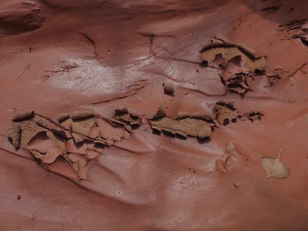 While many areas of the desert wash we walked along looked wet, I noticed one spot where the top layer of soil was shiny as if wet, but cracked and peeling, revealing the dryer soil beneath.
